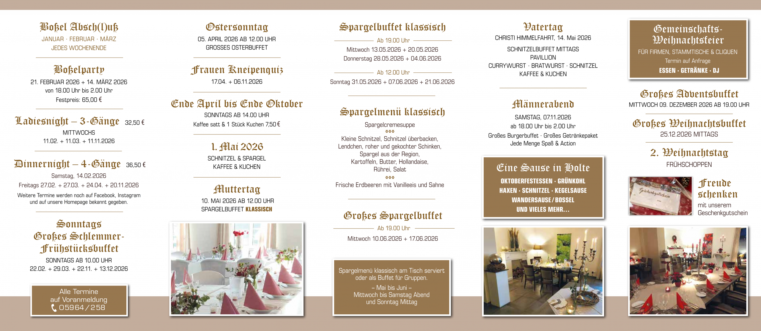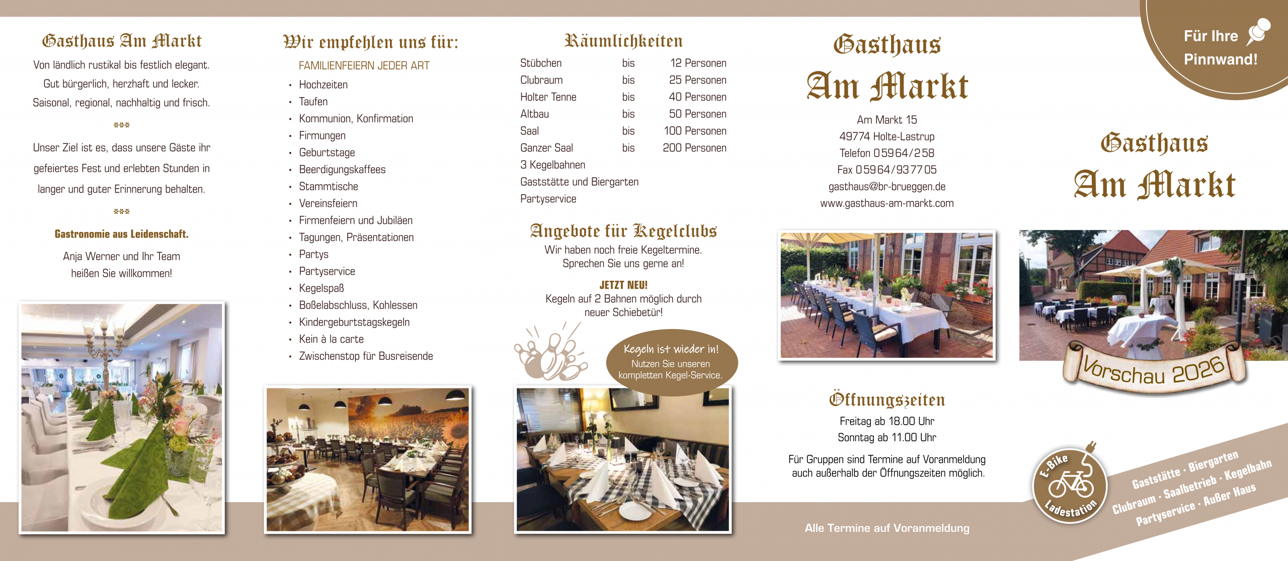 Das Konzept des Hauses sieht die Kneipe als Treffpunkt für den Ort an. Hier gibt es auch die Sky-Bundsligakonferenz zu sehen. Unser Schwerpunkt sind Feiern aller Art. Das Gasthaus am Markt ist hier sehr flexibel. Der Saal kann bis zu 200 Personen aufnehmen, er kann aber auch halbiert werden. Im Altbau sind Personengruppen bis zu 50 Gästen gut aufgehoben. Die „Holter Tenne“ bietet Platz für bis zu 40 Personen und in den Clubraum passen ungefähr 25 Gäste. Besonders für Gruppen bis zu 12 Personen empfehlen wir unser „Stübchen“. Dazu kommen drei moderne Kegelbahnen. Für zu Hause bietet unser Team einen Partyservice an. Das Essen wird komplett über telefonische Voranmeldungen organisiert.